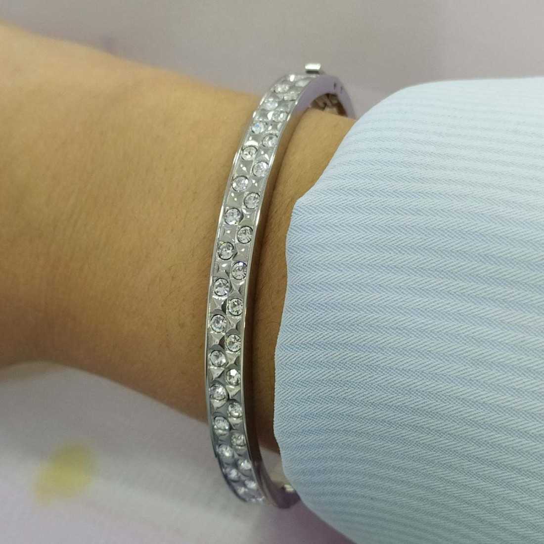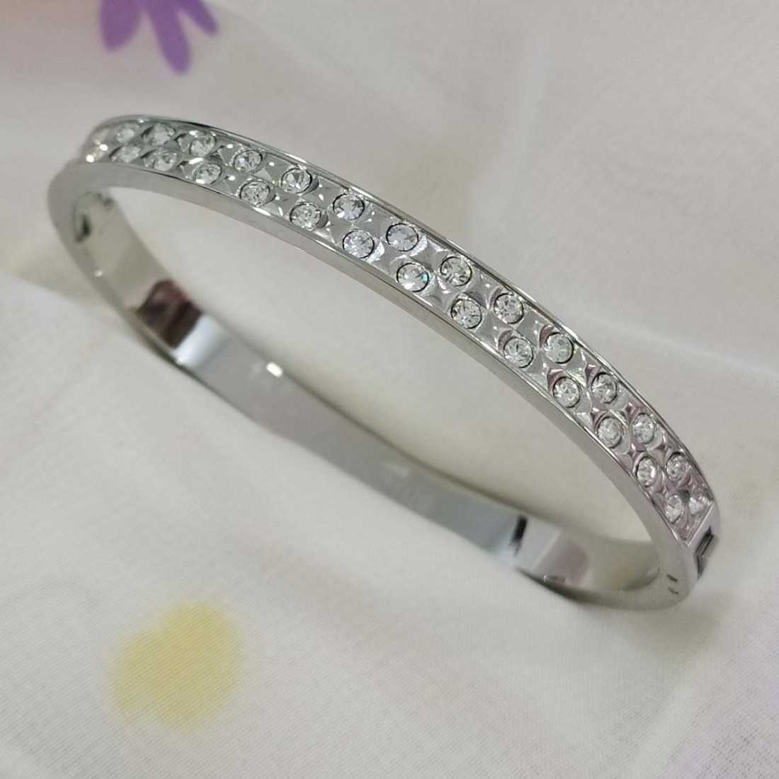 La pulsera presenta un diseño rígido con circonitas engastadas en la parte delantera en forma de zigzag, añadiendo un toque distintivo y elegante. Con una longitud de 61.0 mm, se ajusta perfectamente a tu muñeca, brindando comodidad y estilo.